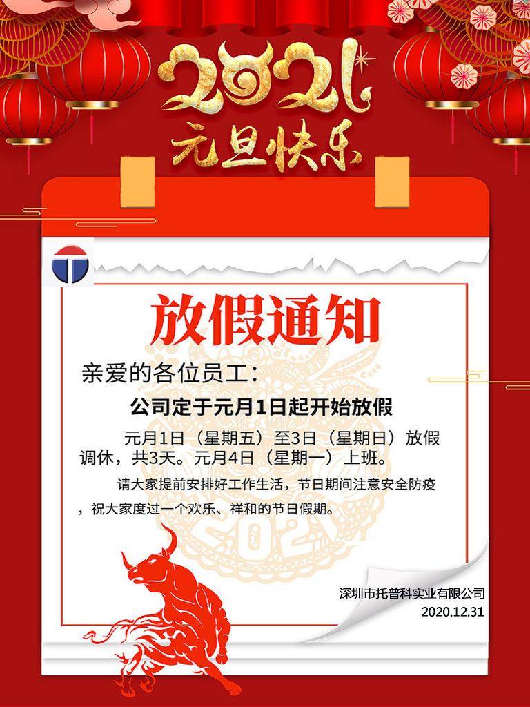 深圳托普科實業有限公司2021年元旦放假通知